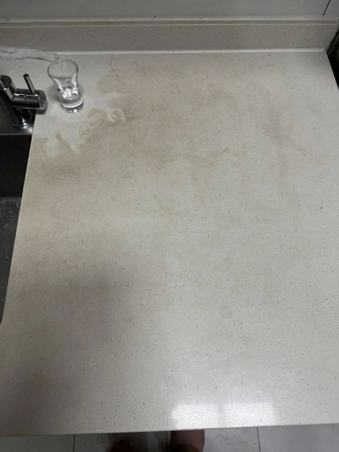 厨房的石英石台面,一旦渗入了污渍,再用普通方法清洁就比较难了。这个时候,可以试试84。